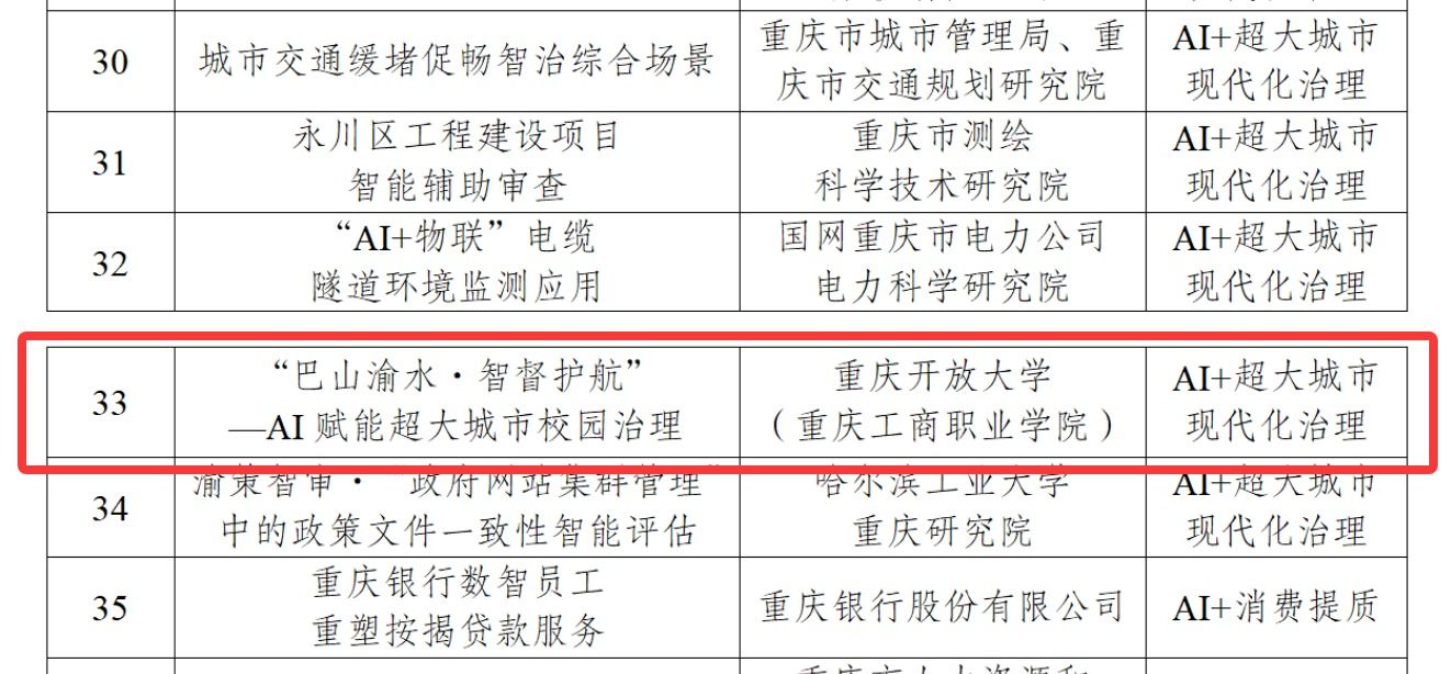 【供稿/纪检监察室】近日,重庆市大数据应用发展管理局与重庆市科学技术局联合发布了2025年度全市优秀人工智能应用场景案例名单。学校报送的《‘巴山渝水·智督护航’——AI赋能超大城市校园治理》案例成功入选。
