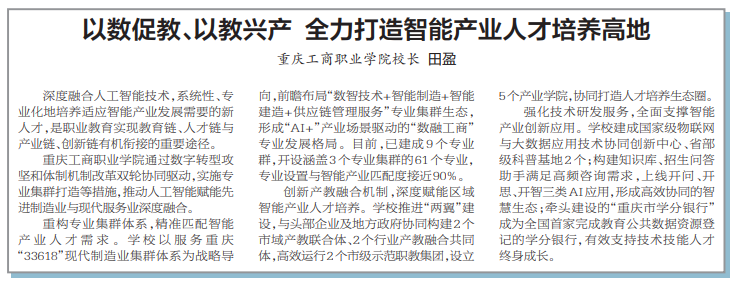 重庆工商职业学院通过数字转型攻坚和体制机制改革双轮协同驱动,实施专业集群打造等措施,推动人工智能赋能先进制造业与现代服务业深度融合。