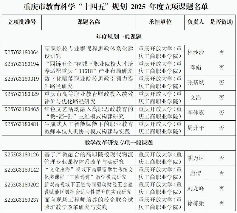 【供稿/社科处】近日,重庆市科学规划领导小组办公室公布2025年度重庆市教育科学规划立项名单,重庆工商职业学院获批10项成果,包括年度规划一般课题6项,教学改革研究专项一般课题4项。