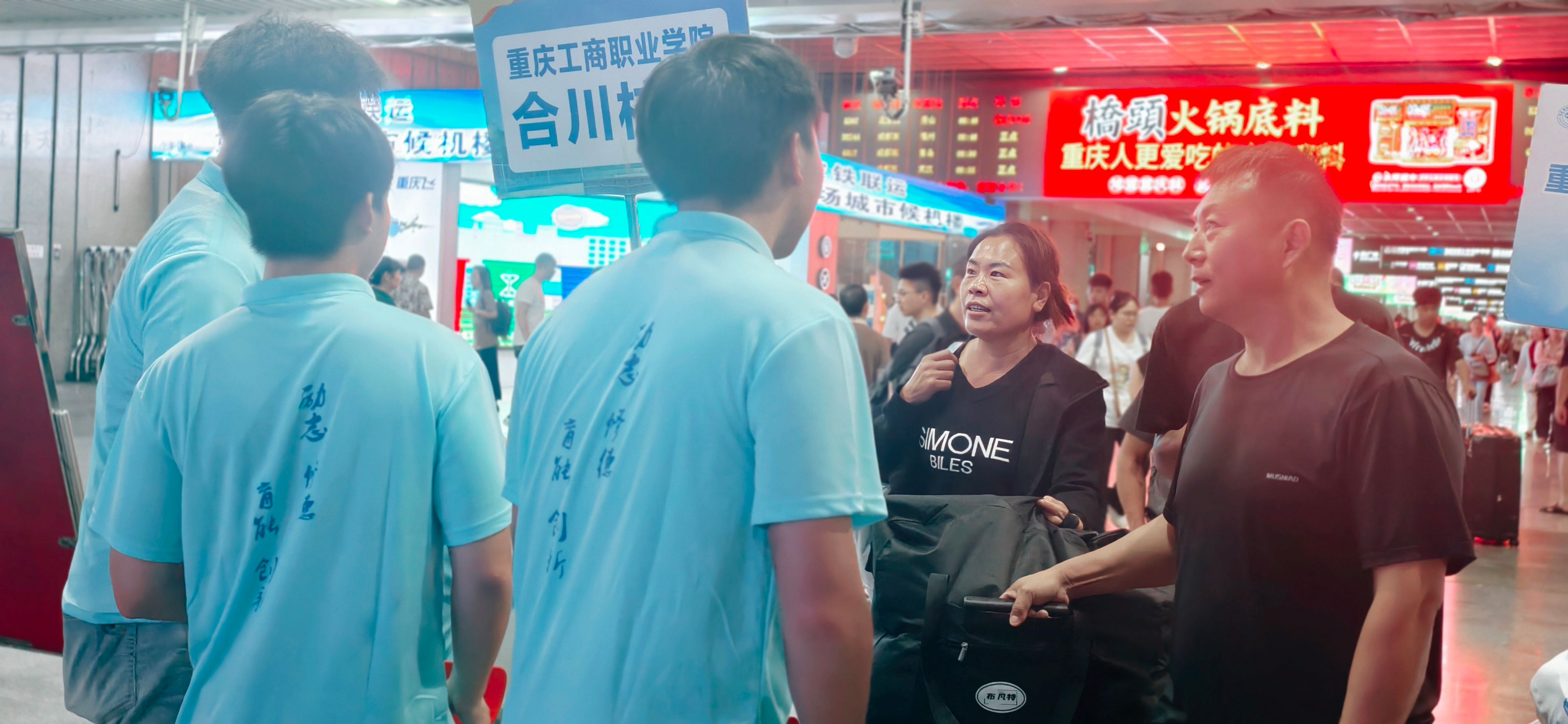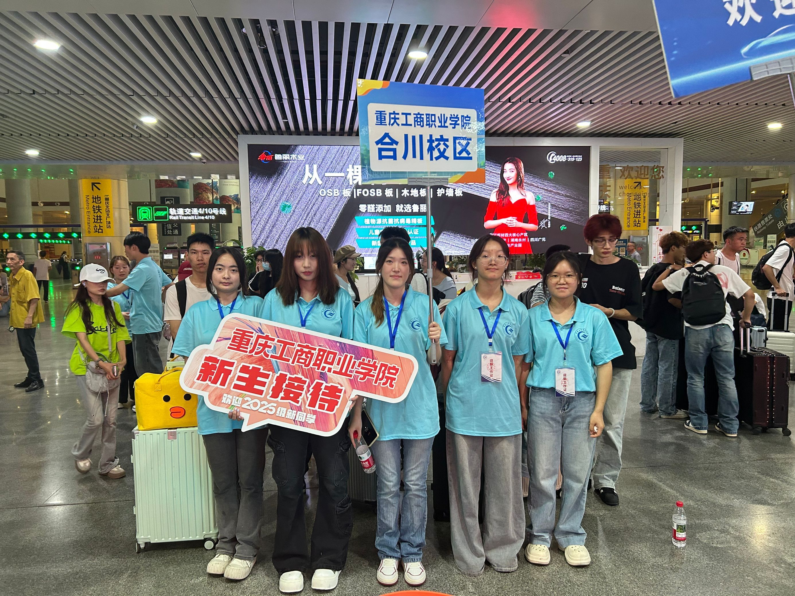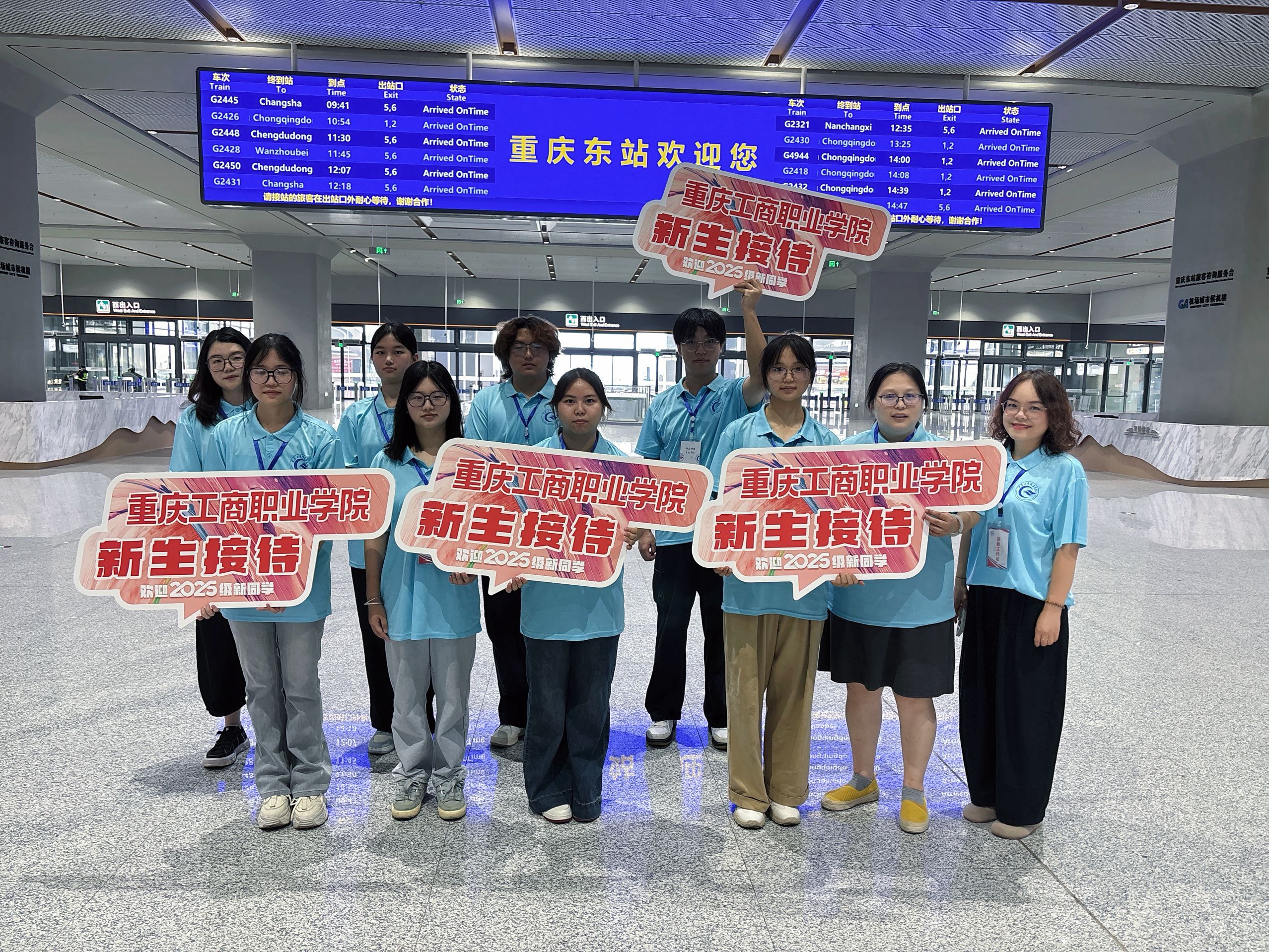 在重庆北站、东站、西站及合川站,24名教师志愿者和48名学生志愿者组成的迎新接待队伍,早早等候在各站点,热情引导新生上车,协助搬运大件行李,确保新生顺利抵校。
