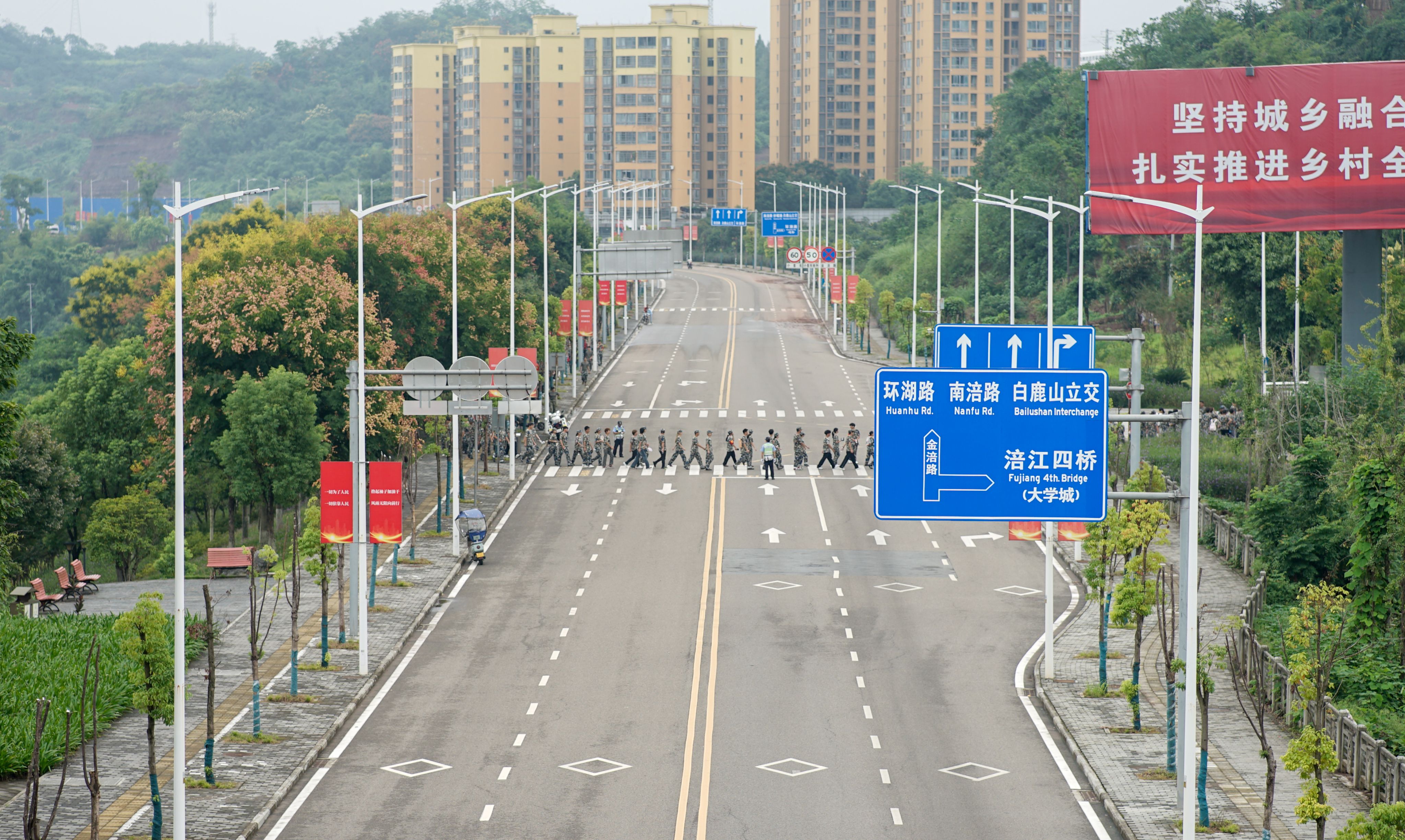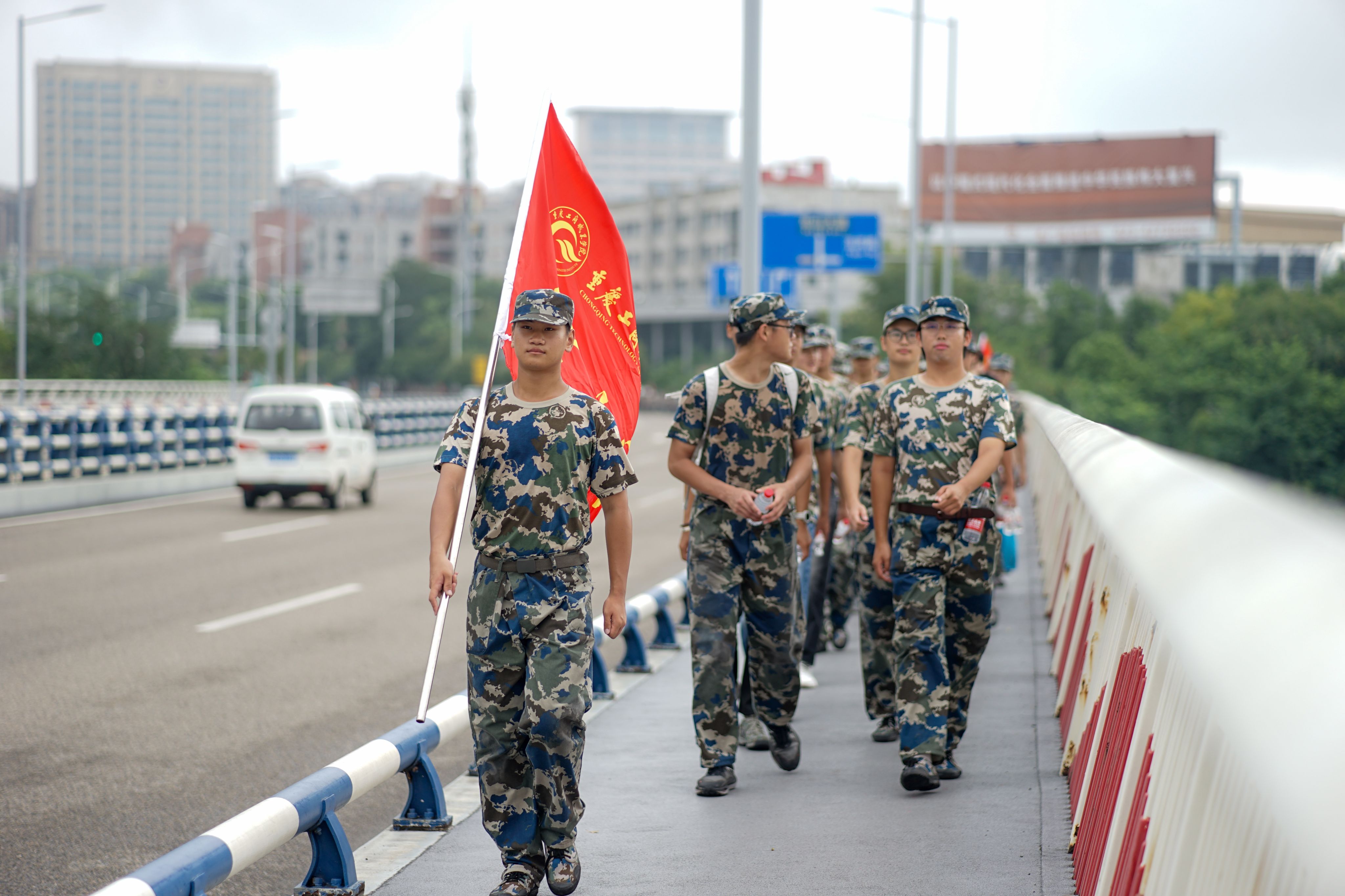 上午9时,刘昌雄宣布拉练开始。各连队依次有序出发。本次拉练全程5.6公里,由学校西门出发,沿涪江四桥和金涪路,抵达赵家渡水生态公园后,原路返回。中午12时,队伍安全返校。