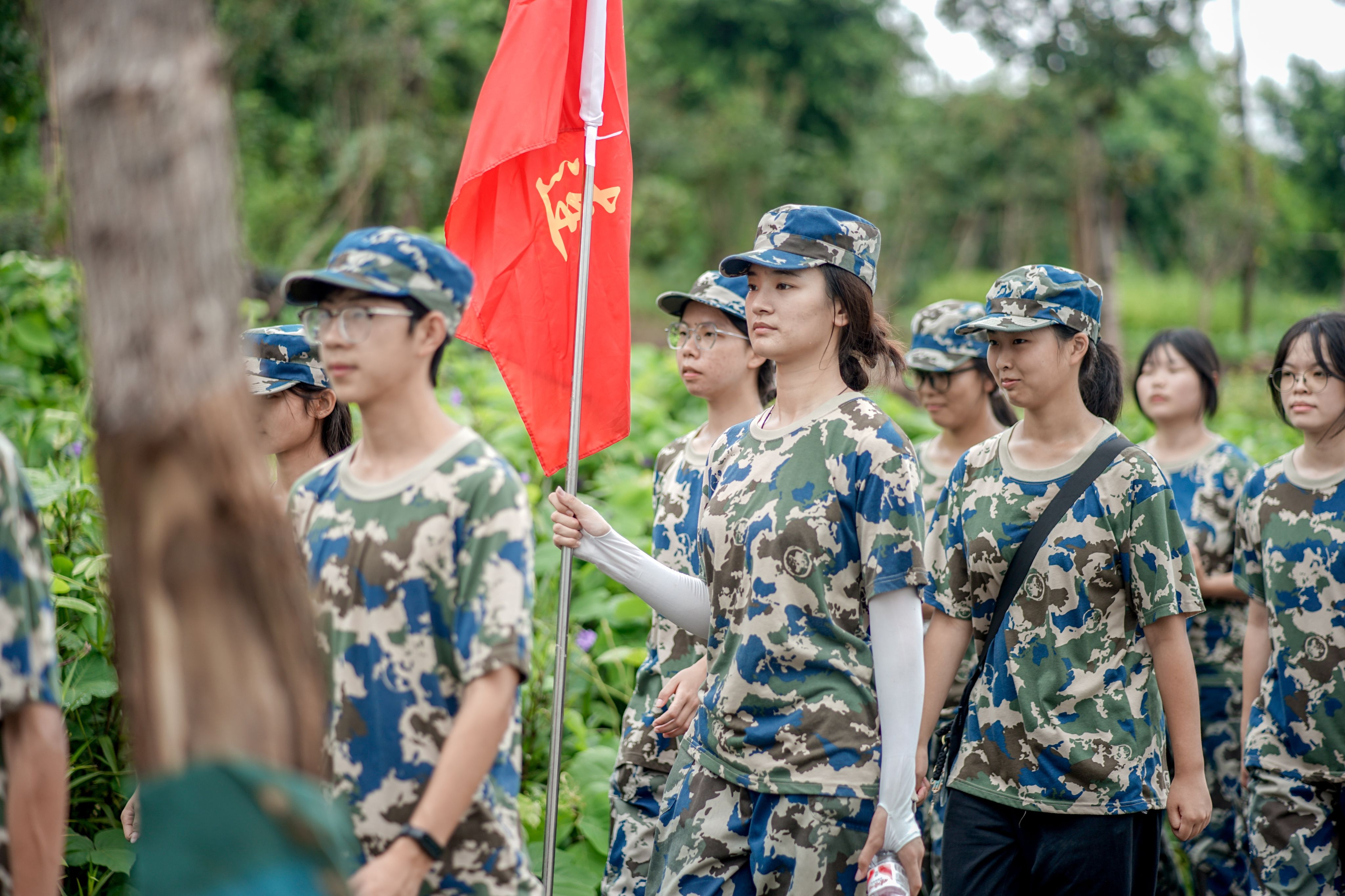 行进途中,尽管天空飘着小雨,同学们依然口号嘹亮、步伐整齐、斗志昂扬。