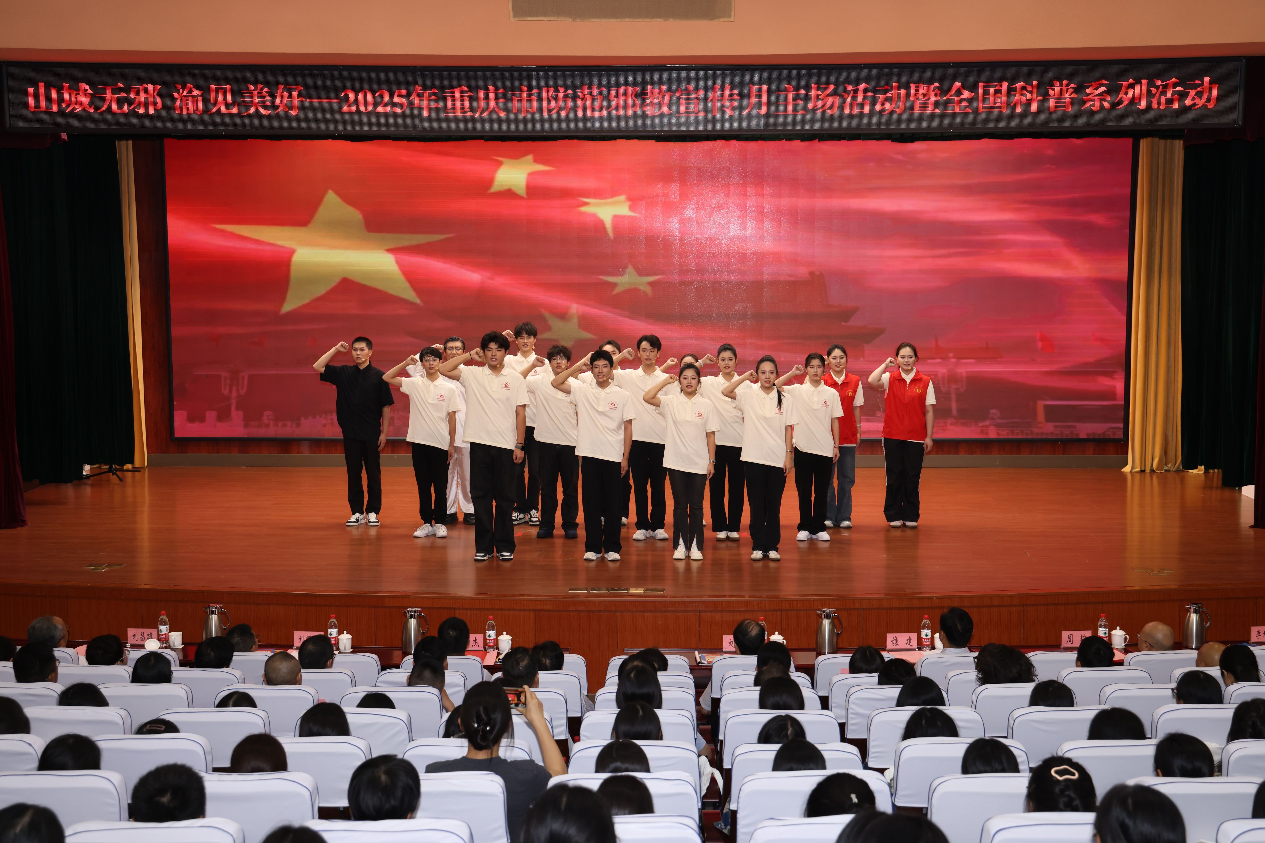 由我校重庆市大学生总体国家安全观宣讲团创作的节目《青春之光驱散阴霾》参加展演,获得现场观众和领导嘉宾的一致好评。该节目通过情景剧、快板、RAP与多人朗诵相结合的形式,深刻揭露了邪教的危害,呼吁广大青年树立科学观念、崇尚文明生活,彰显了我校学子良好的精神风貌和强烈的社会责任意识。