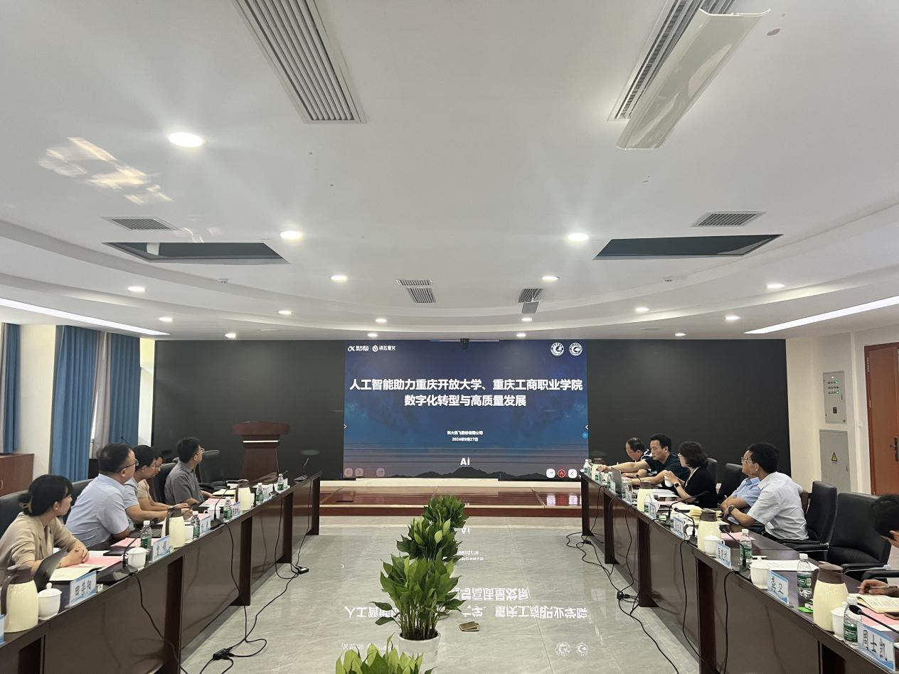【供稿/对外合作处】9月27日,学校与科大讯飞股份有限公司在华岩校区109会议室就产教融合、校企合作相关事宜进行了交流洽谈。科大讯飞股份有限公司副总裁、高教业务部总经理陈红斌,科大讯飞重庆公司总经理杨康、校长李国、副校长南旭光、副校长罗晓良出席了会议,科大讯飞股份有限公司业务相关负责人、学校各相关二级学院(部门)负责人参加了会议。会议由副校长罗晓良主持。